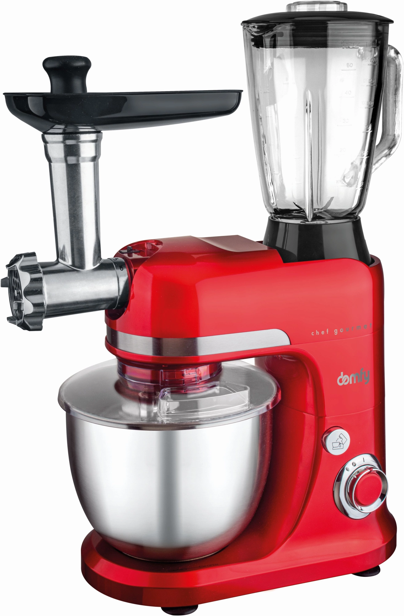 Планетарное вращение - ДА; Объем чаши - 5 л; Материал корпуса - пластик; Количество насадок в комплекте - 5 шт; Другие комплектующие - насадка- мясорубка, насадка-блендер; Цвет - красный; Мощность - 2000 Вт; Количество скоростей - 6;
