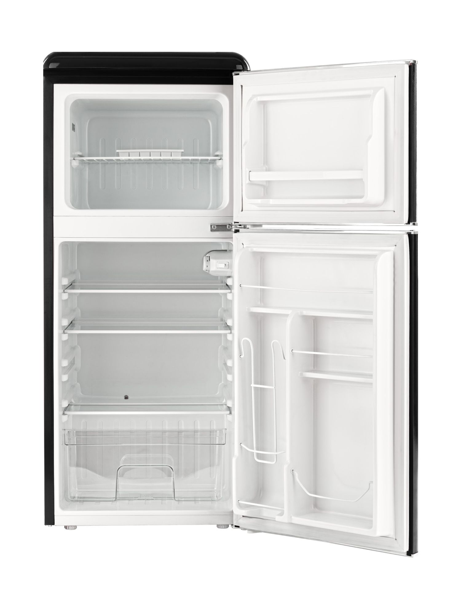 Общий объем, л - 127; Размеры, мм (ШхГхВ) - 486 x 520 x 1130; Размораживание - Капельная система; Общий объем холодильной камеры, л - 89; Класс энергопотребления - A+; Общий объем морозильной камеры, л - 38; Макс. уровень шума, дБ - 43; Количество камер - 2; Климатический класс - SN-ST +10°C / +38°C; Открывание дверей - Вправо; Тип - Холодильник; Цвет - Черный,хром; Годовое потребление, кВт ч/год