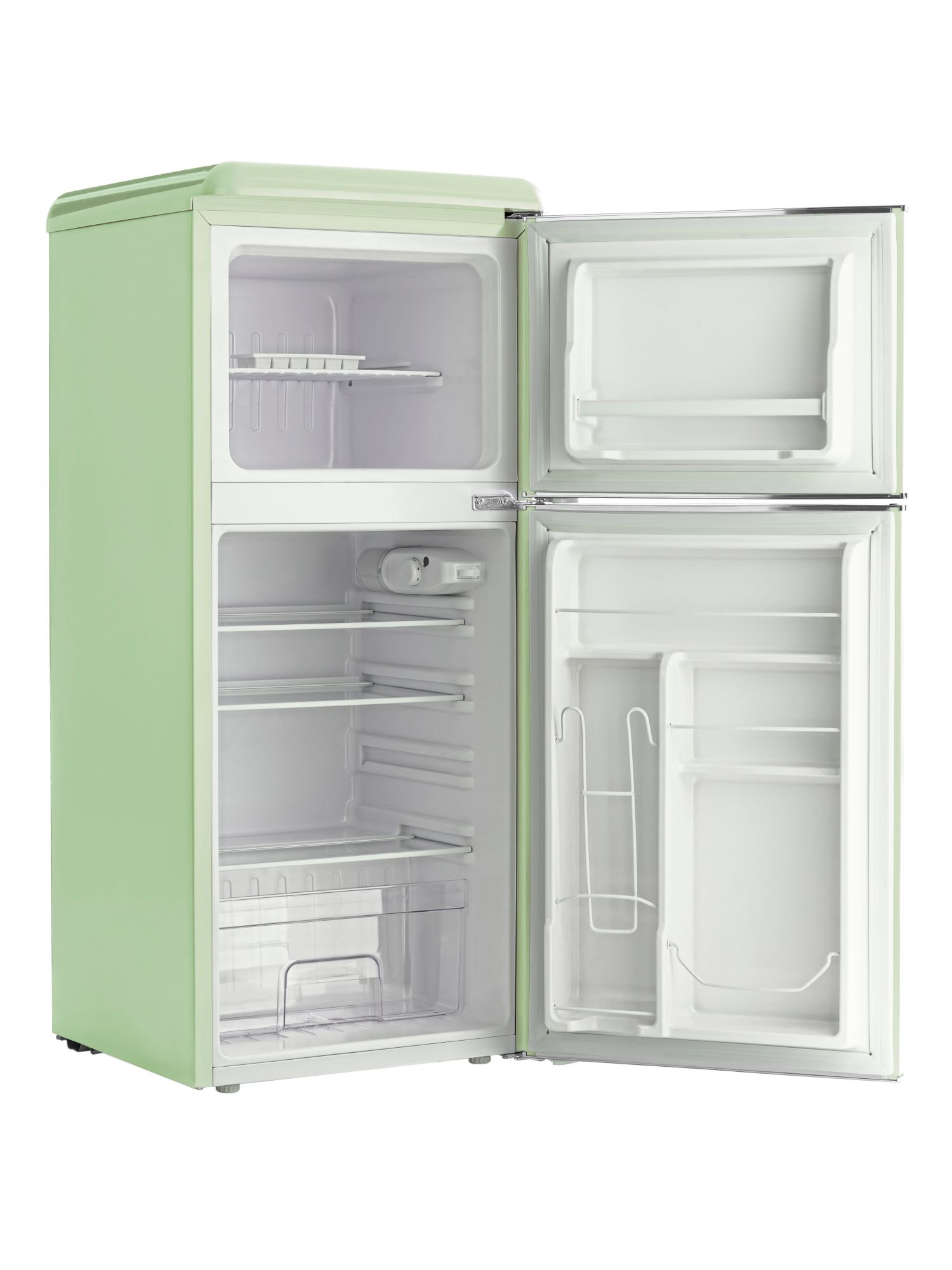 Общий объем, л - 127; Размеры, мм (ШхГхВ) - 486 x 520 x 1130; Размораживание - Капельная система; Общий объем холодильной камеры, л - 89; Класс энергопотребления - A+; Общий объем морозильной камеры, л - 38; Макс. уровень шума, дБ - 43; Количество камер - 2; Климатический класс - SN-ST +10°C / +38°C; Открывание дверей - Вправо; Тип - Холодильник; Цвет - Светло-зеленый,хром; Годовое потребление, кВ